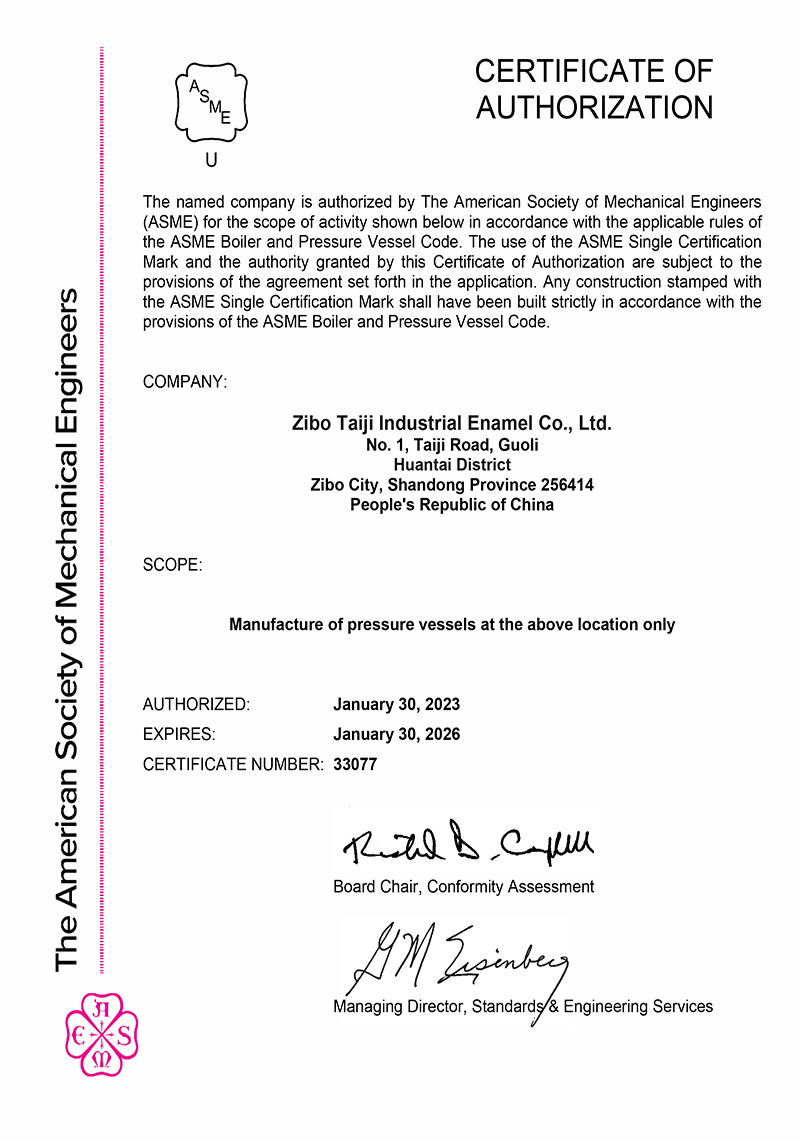 淄博太極在中國搪玻璃設(shè)備制造行業(yè)中首家通過ISO90001質(zhì)量體系認(rèn)證,并擁有美國ASME認(rèn)證、歐洲PED認(rèn)證以及國家部門頒發(fā)的搪玻璃制造許可證、進(jìn)出口許可證和百余項(xiàng)榮譽(yù)證以及三十六項(xiàng)專利等。